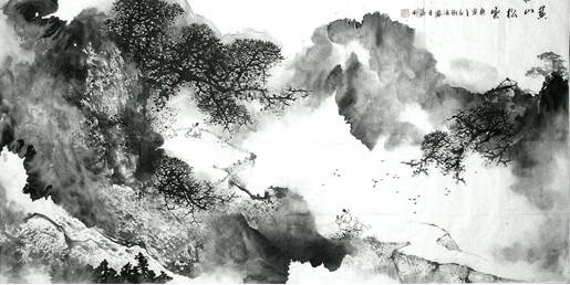 在中国画创作理论中一直有言:“搜尽奇峰打草稿”,画家只有融入自然之中方可创作出真正的艺术精品,张大千隐居青城山、刘海粟十上黄山,诸如此例不胜枚举,这些经历都为画家的艺术创作提供了素材与灵感。树勇在此亦不例外,长期游历写生的积累,为他的泼墨提供了丰富的创作素材,笔墨也由此脱胎于自然的造化,使他的作品具有深厚的笔墨内涵,树勇将大自然的神奇幽深、明灭显晦的景色挪移到有限的画纸之上,并显示出阴明清晦的万千变化,不禁使人啧啧称奇。